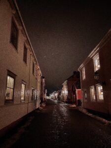 Vandrar omkring med hunden Kya på mörka gator i den lilla stad där jag hamnat. Gatlyktor sprider ett varmt, gult sken över frusna kullerstenar, och jag är på inget sätt vän med vintern. Fuktiga, bitande vindar blåser in från Vättern, och gör min hud ömtålig. Det är väldigt tomt på gatorna, det är knappt ens hundägare ute. Det är för kallt för våra fyrbenta vänners mjuka tassar.